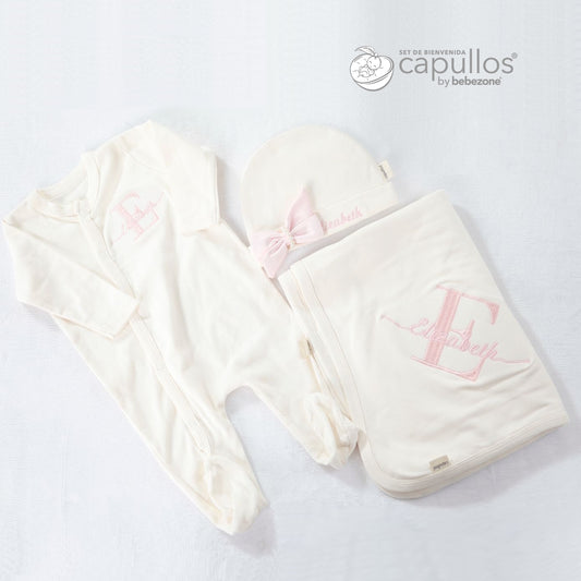 Set de Bienvenida Personalizado Capullos Beige de Niña en Algodón Peinado