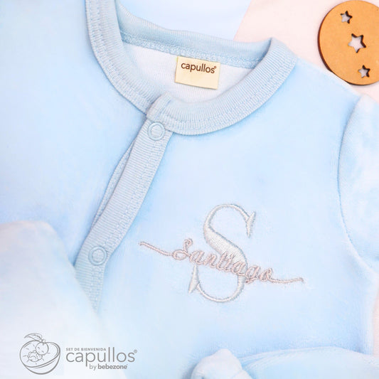 Set de Bienvenida Personalizado Capullos Azul de Niño en Velour